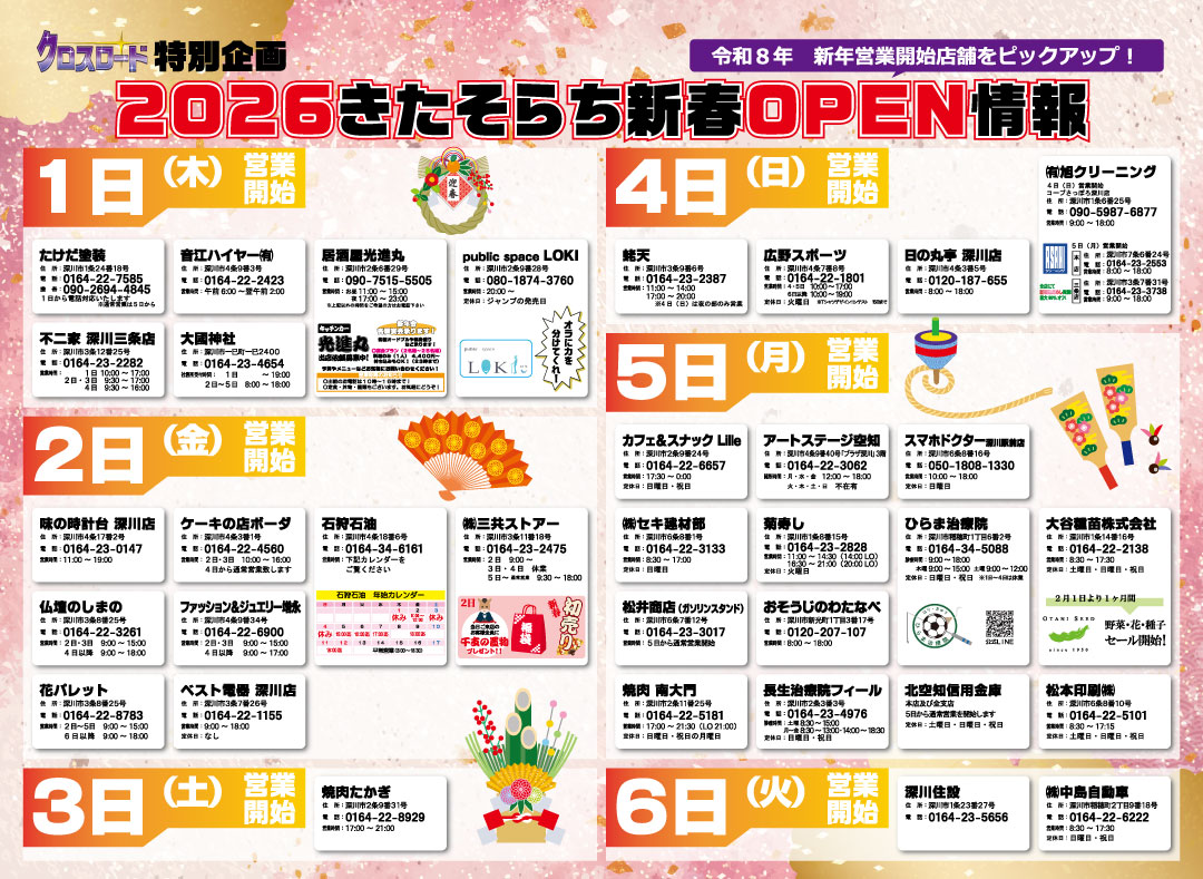 2018.03.192026.01.08 クロスロード最新号「No.94」 次回発行日 2026年1月号が発行されました! 次回、2026年2月号は、2月1日発行です。申し込みされる場合は、下記の電話もしくはお問い合わせフォームをご利用ください。 申込〆切2026年1月19日 17時30分まで原稿入稿〆切2026年1月20日 16時まで ※申し込み状況によっては申込〆切日より前に締切らせていただく場合がございます。 電話:0164-22-5101 お問い合わせフォーム